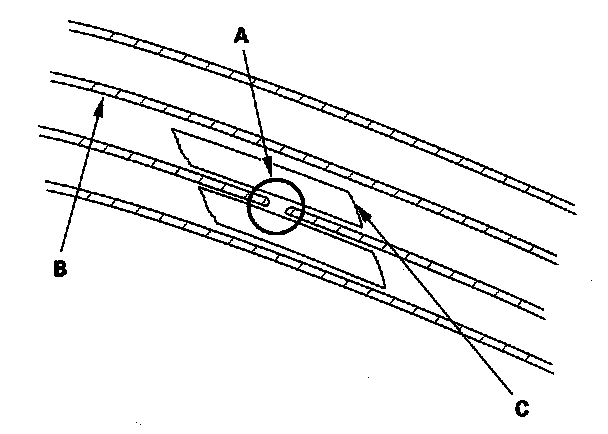 2. Carefully mask above and below the broken portion of the defogger wire (B) with cellophane tape (C).