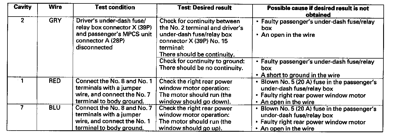 6. Reconnect the connector to the right rear power window switch, and make these input tests at the connector.