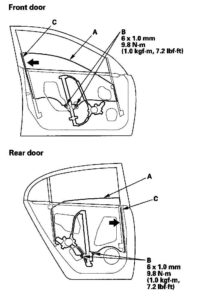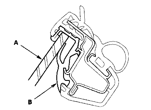 6. Raise the glass fully, and check for gaps. Also check that the glass (A) contacts the glass run channel (B) evenly.