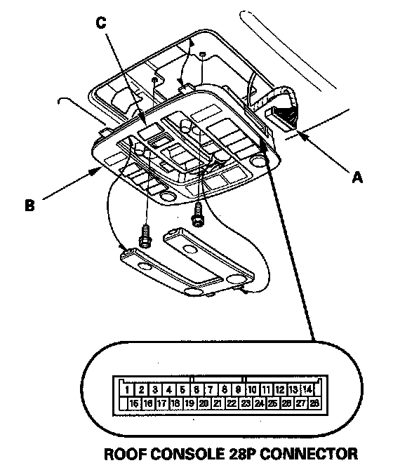 2. Disconnect the 28P connector (A) from the roof console (B).