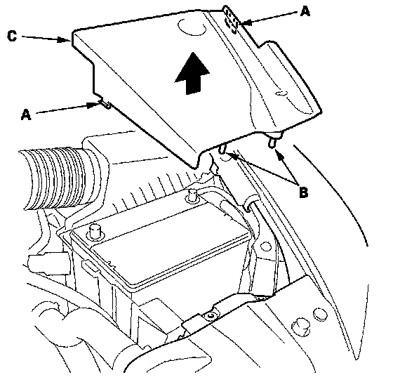2. Release the hooks (A) and pins (B), then remove the left side engine compartment cover (C).
