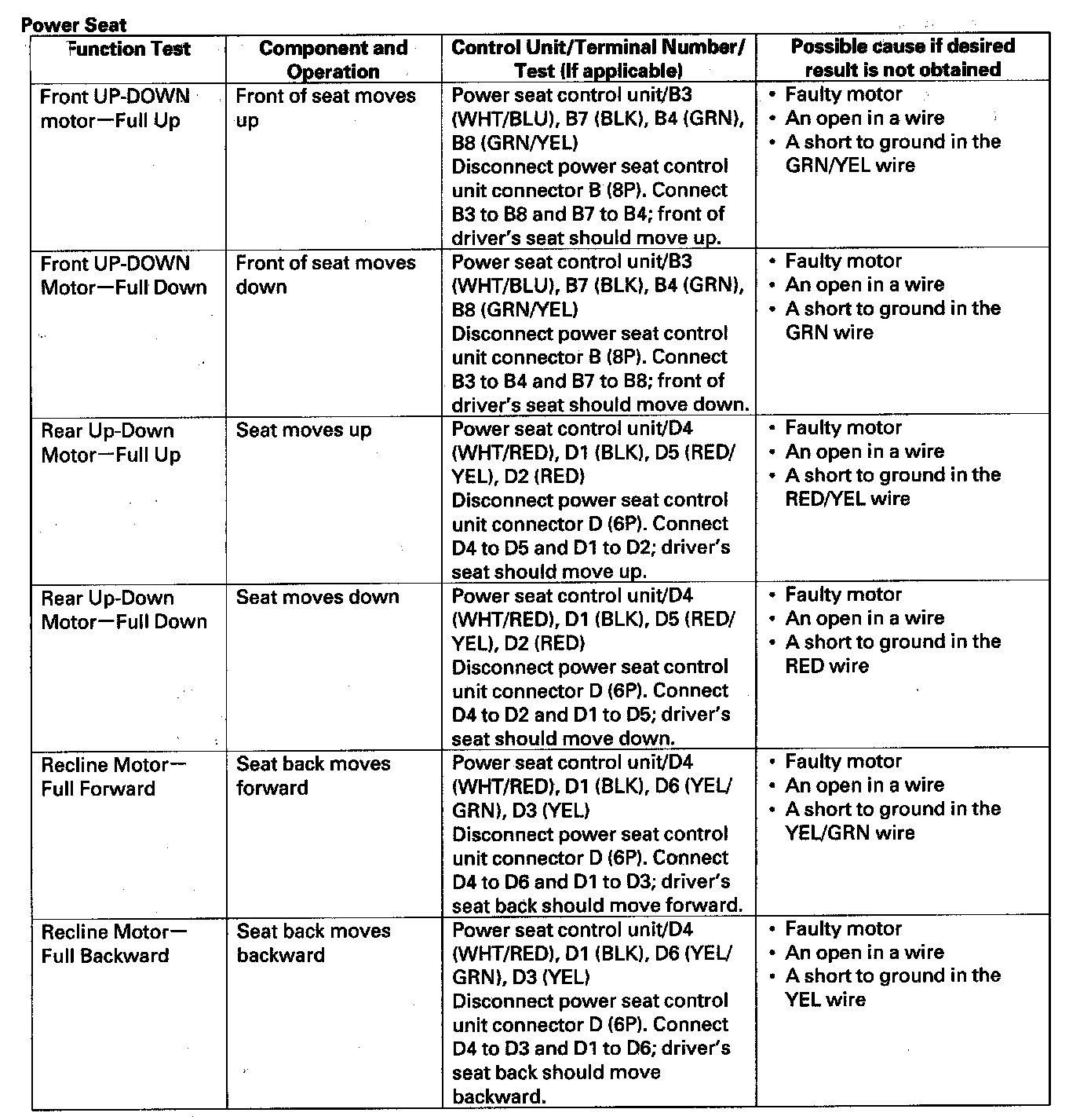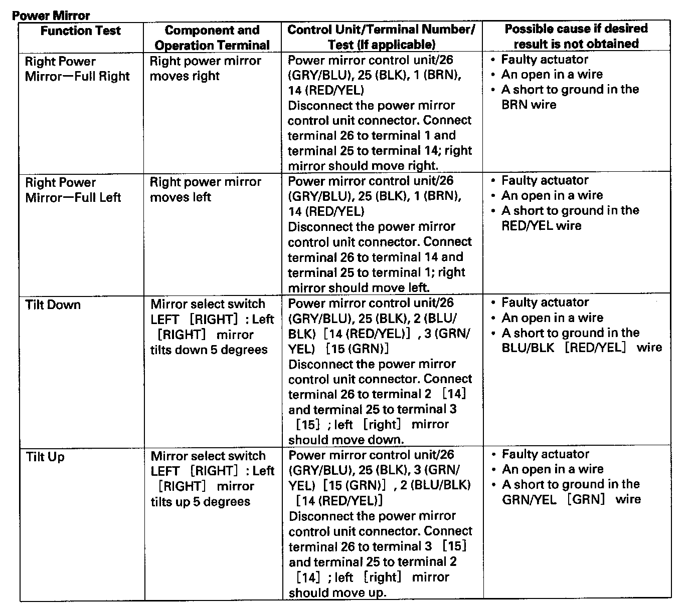 - If the function does not occur, perform the appropriate test at the control unit and terminal indicated in the table.