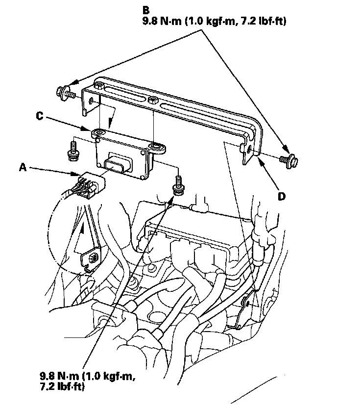 5. Remove the yaw rate-lateral acceleration sensor (C) with the bracket (D).