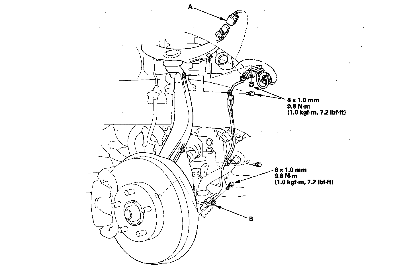 3. Remove the bolts, the nut, and the wheel sensor (B).