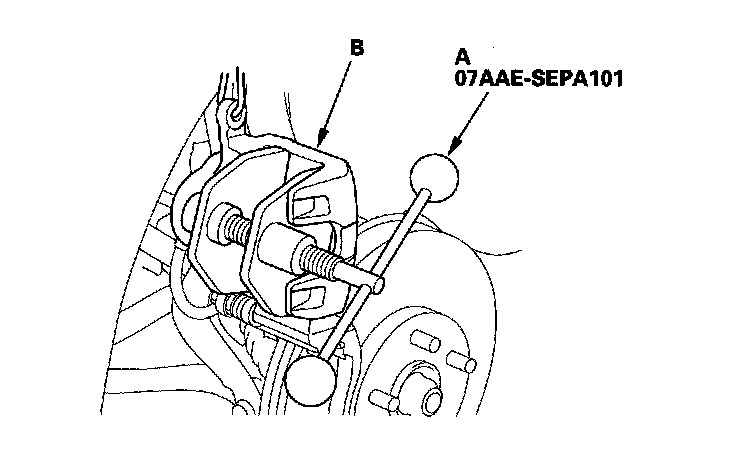 8. Clean the caliper bracket (B) thoroughly; remove any rust, and check for grooves and cracks.