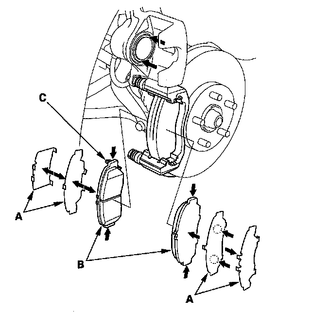 12. Install the brake pads and pad shims correctly. Install the brake pad with the wear indicator (C) on the upper outside. If you are reusing the brake pads, always reinstall the brake pads in their original positions to prevent a momentary loss of braking efficiency.