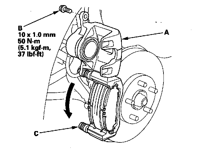 5. Remove the flange bolt (B) while holding the caliper pin (C) with a wrench being careful not to damage the pin boot, and pivot the caliper (D) up out of the way. Check the hose and pin boots for damage and deterioration.