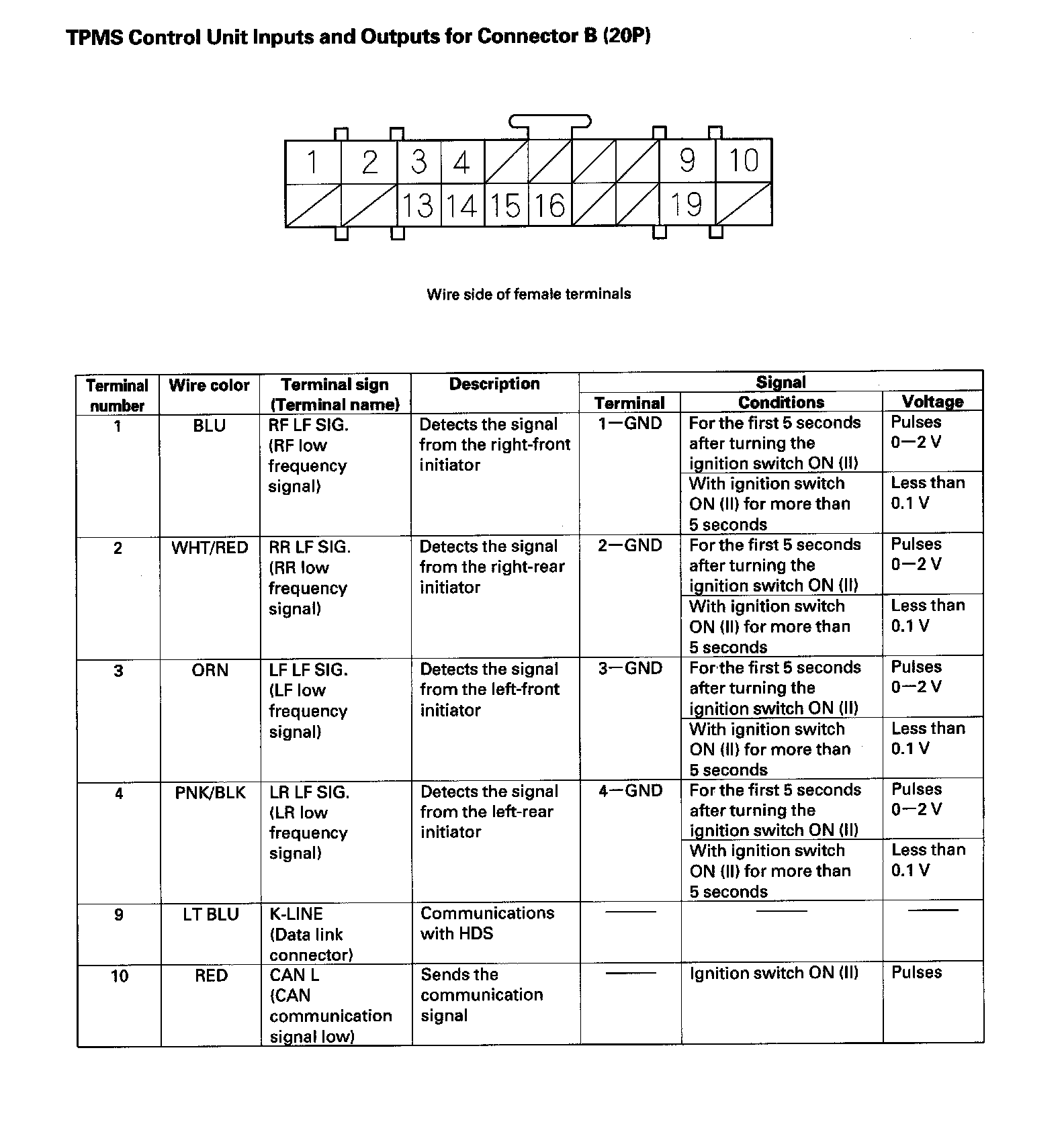 TPMS Control Unit Inputs and Outputs for Connector B (20P) (Part 1):