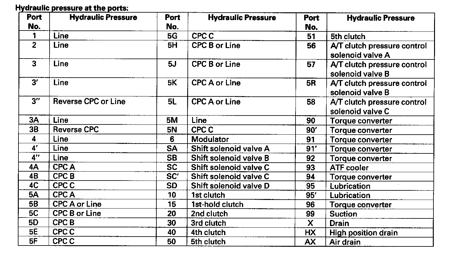 The PCM controls shift solenoid valves A, B, C, and D ON and OFF, and the shift solenoid valves control shift solenoid pressure to the shift valves. Applying shift solenoid pressure to the shift valves moves the position of the shift valve, and switches the port of hydraulic pressure. The PCM also controls A/T clutch pressure control solenoid valves A, B, and C. The A/T clutch pressure control solenoid valves regulate A/T clutch pressure control solenoid valve pressure and apply A/T clutch pressure control solenoid valve pressure to CPC valves A, B, and C.