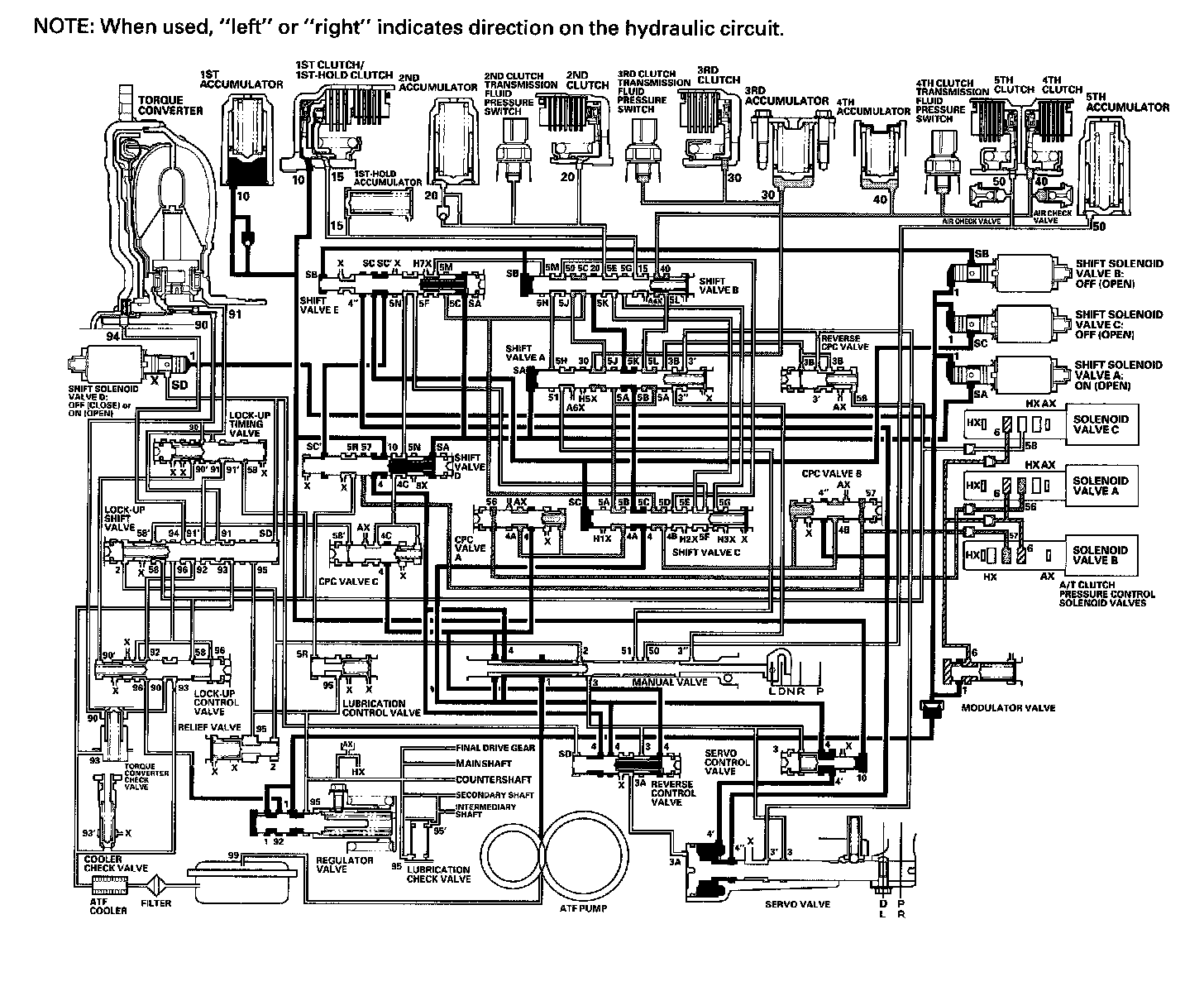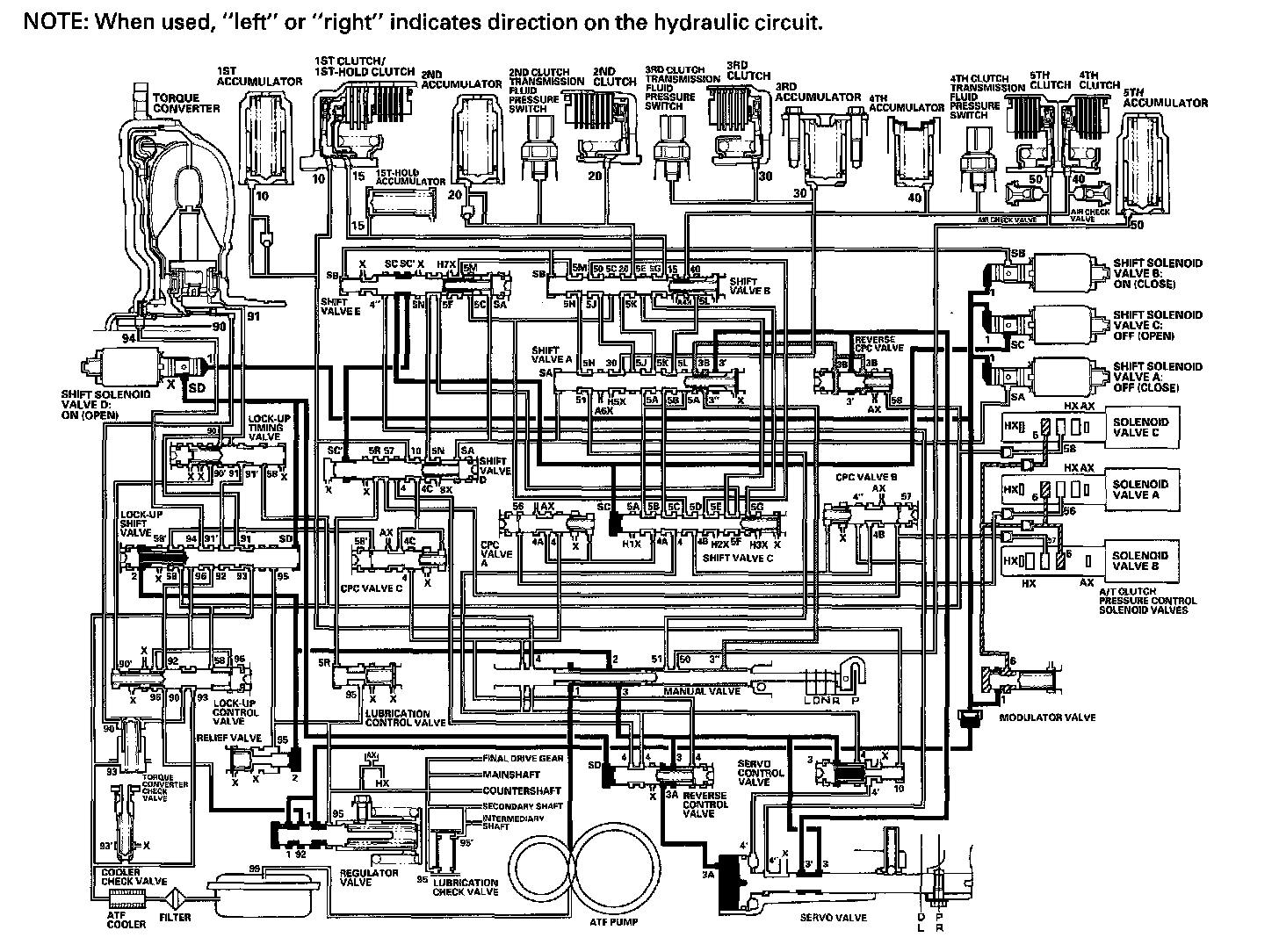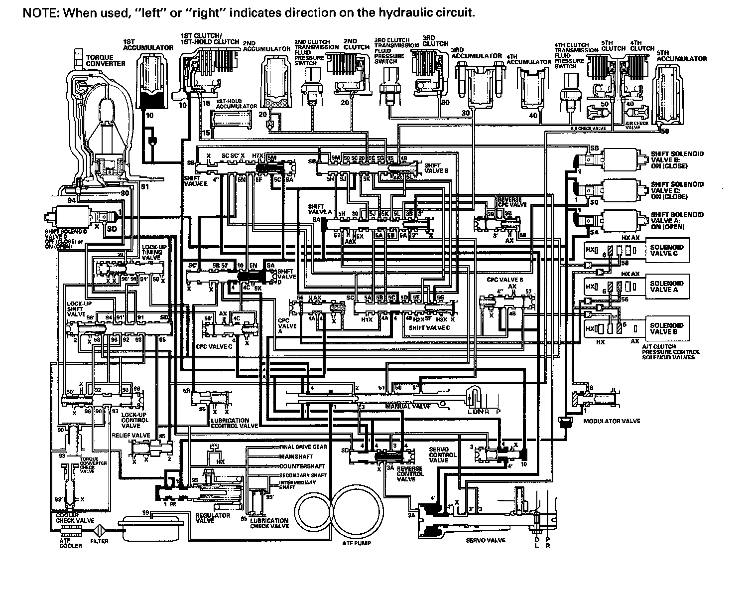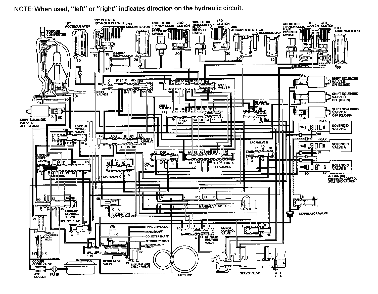 As the speed of the vehicle reaches the programmed value, the PCM turns shift solenoid valve A ON, and shift solenoid valve A uncovers the port of shift solenoid valve A pressure (SA) to shift valve A. Shift valve A is moved to the right side to switch the port of line pressure (3') and reverse CPC pressure (3B) leading to the 5th clutch. Line pressure (3) flows to the manual valve via the servo valve and shift valve A, and becomes 5th clutch pressure (50) at the manual valve. The 5th clutch pressure (50) flows to the 5th clutch, and the 5th clutch is engaged with the line pressure mode.