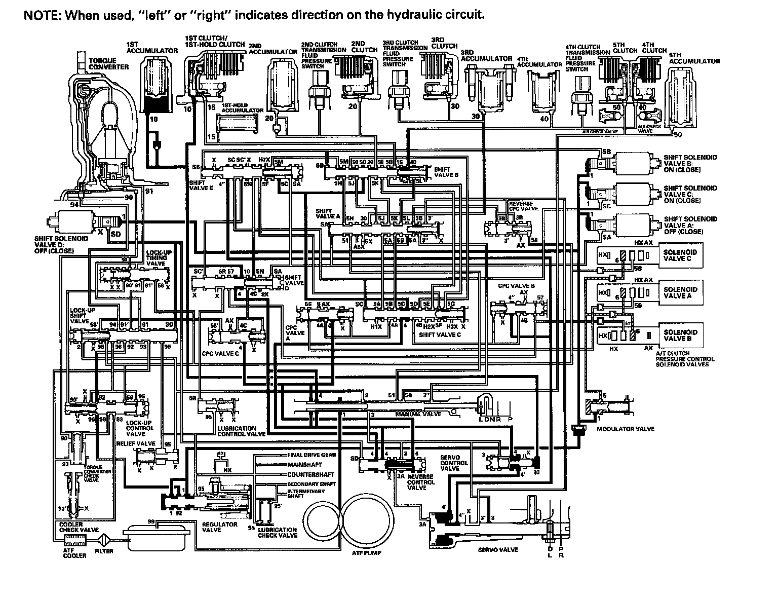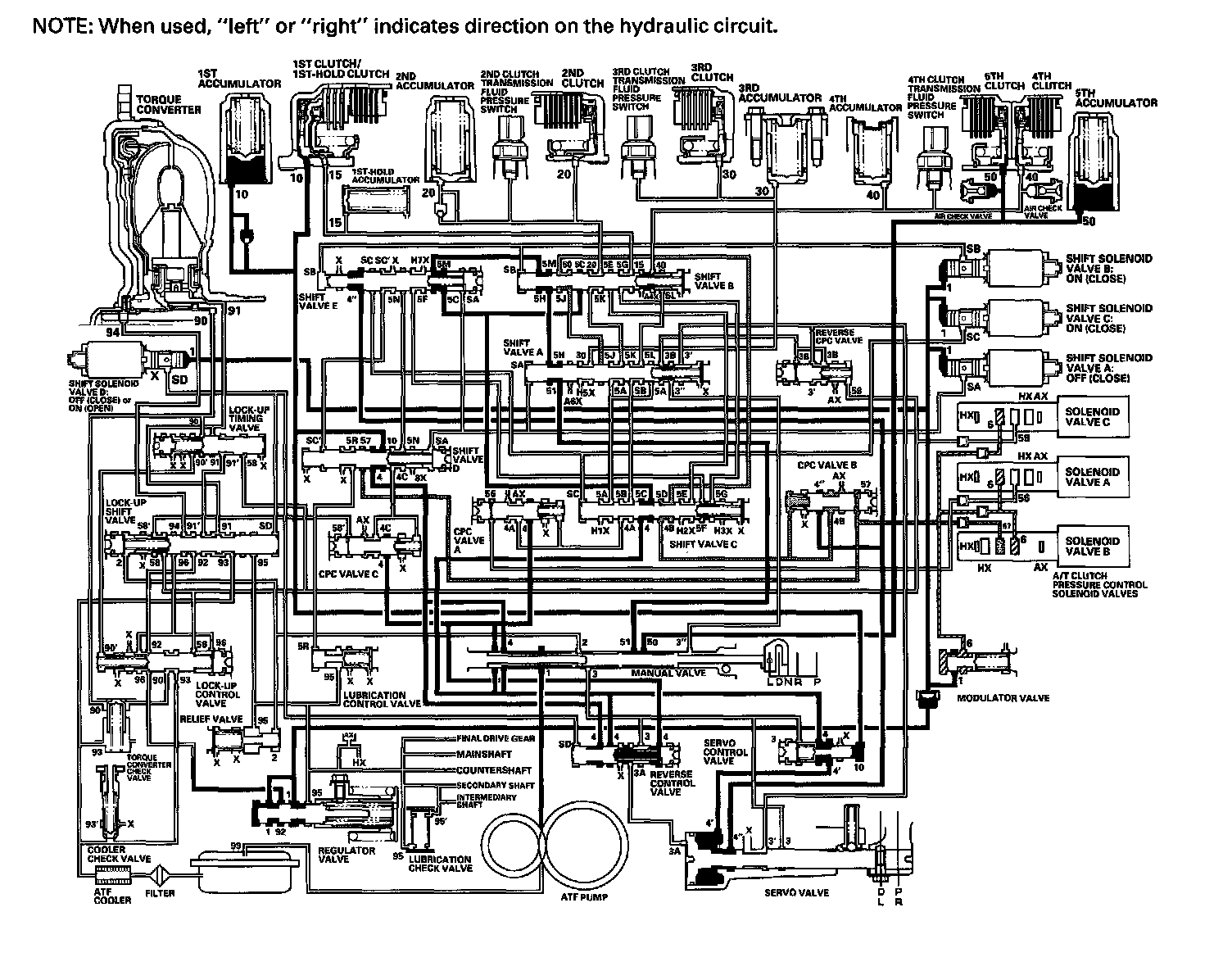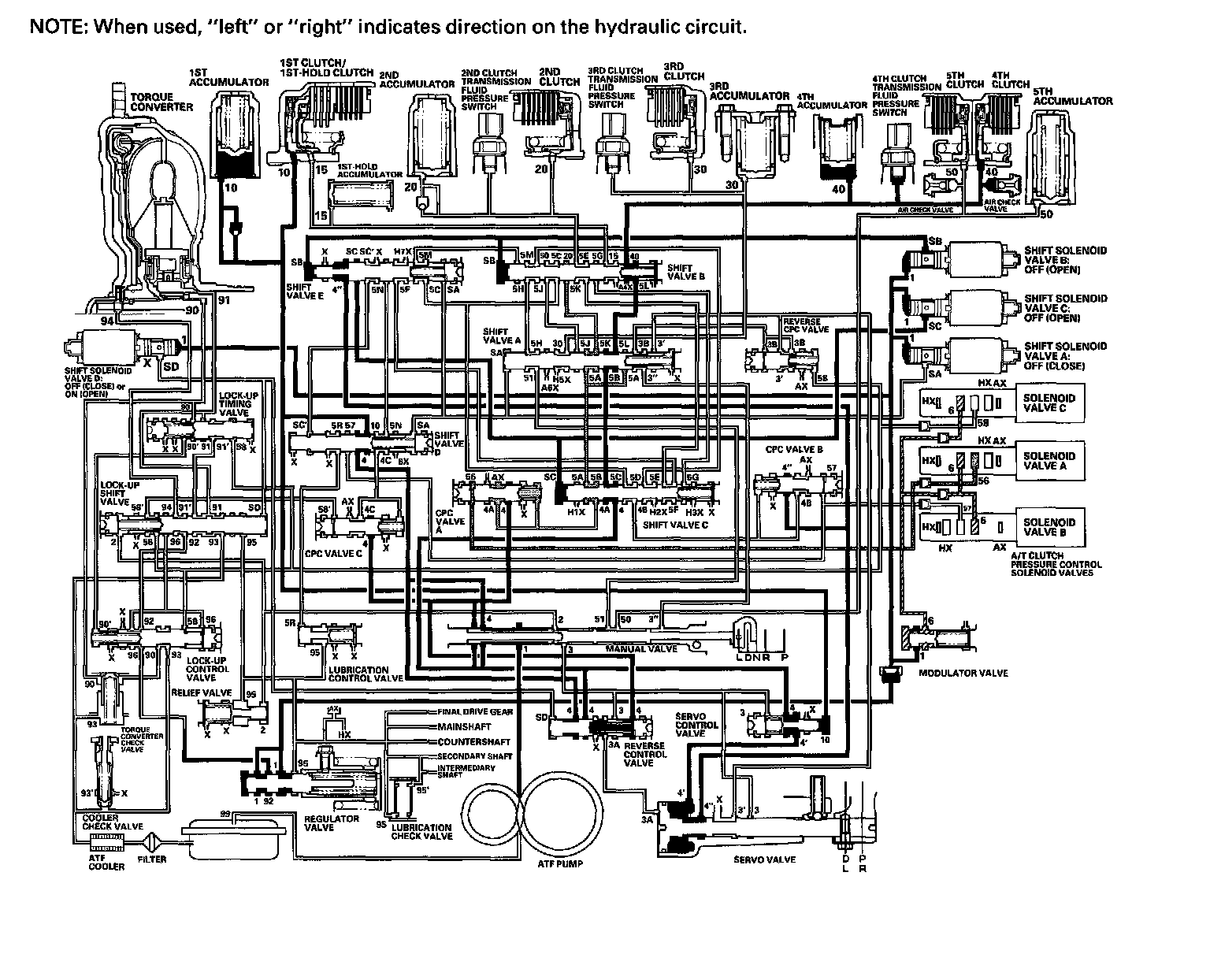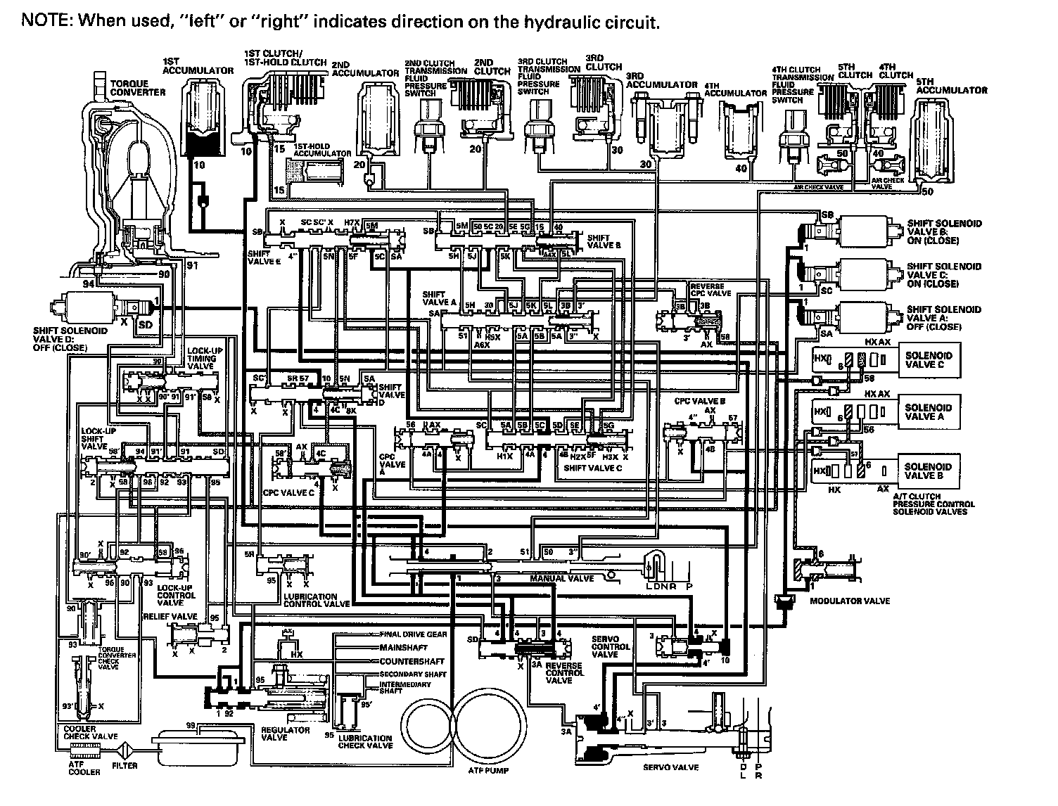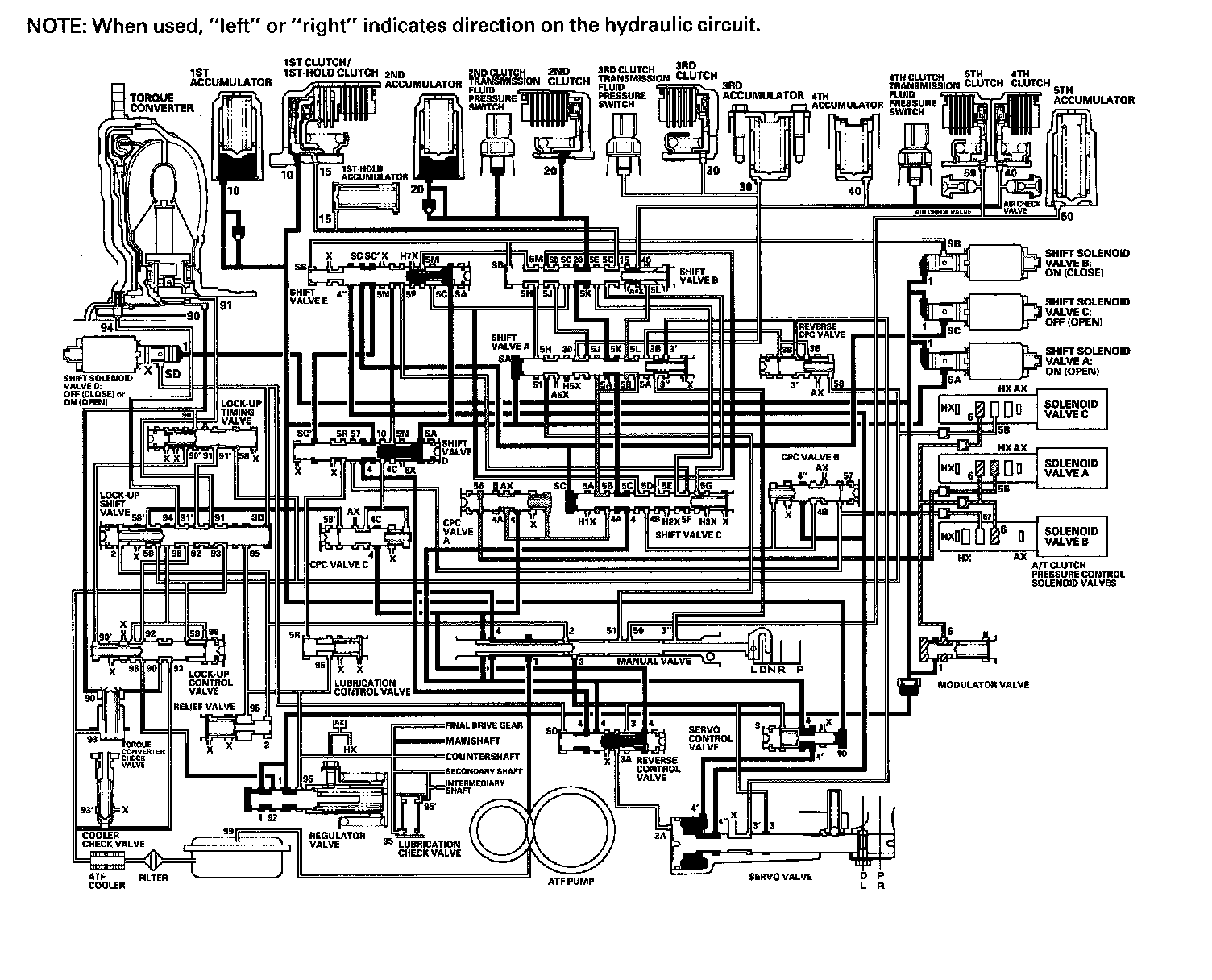 As the speed of the vehicle reaches the programmed value, the PCM turns shift solenoid valve A ON, and shift solenoid valve A uncovers the port of shift solenoid valve A pressure (SA) to shift valve A. Shift valve A is moved to the right side to switch the port of line pressure (3') and reverse CPC pressure (3B) leading to the 5th clutch. Line pressure (3) flows to the manual valve via the servo valve and shift valve A, and becomes 5th clutch pressure (50) at the manual valve. The 5th clutch pressure (50) flows to the 5th clutch, and the 5th clutch is engaged with the line pressure mode.
