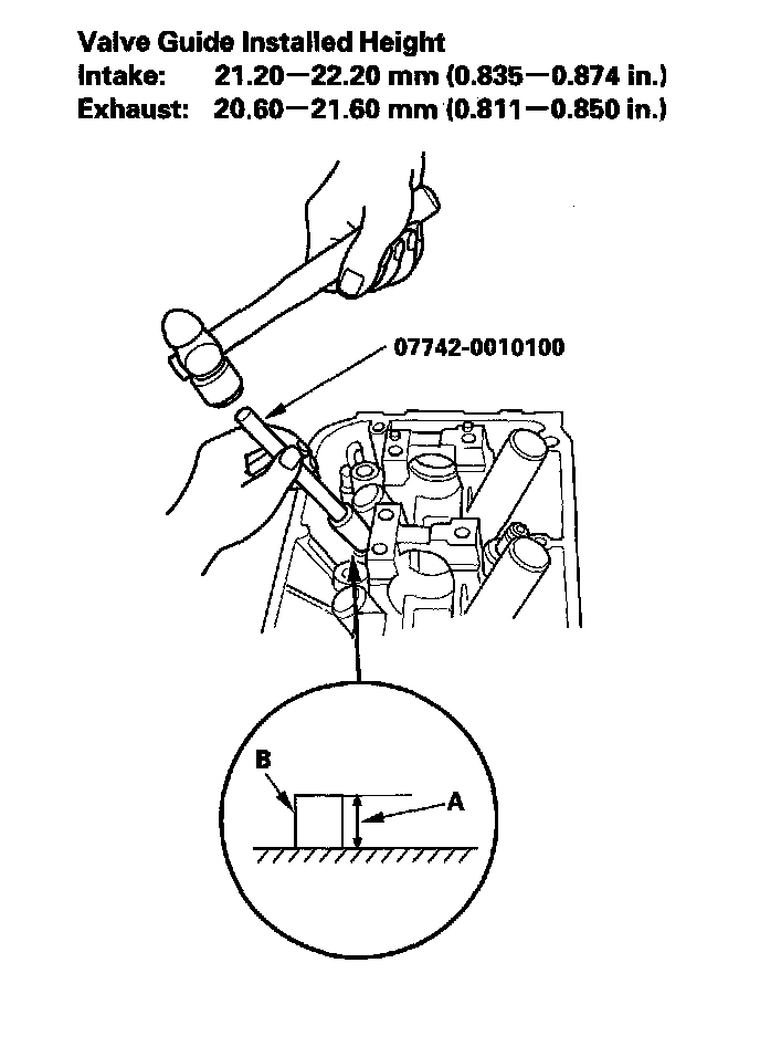 9. Apply a thin coat of new engine oil to the outside of the new valve guide. Install the guide from the camshaft side of the head; use the special tool to drive the guide to the specified installed height (A) of the guide (B) if you have all 12 guides to do, you may have to reheat the head.