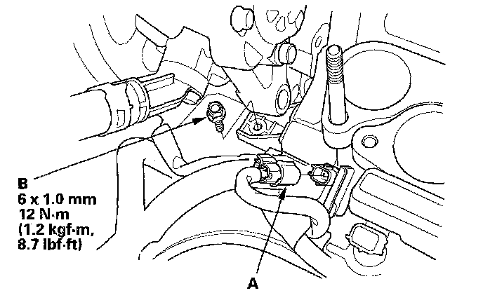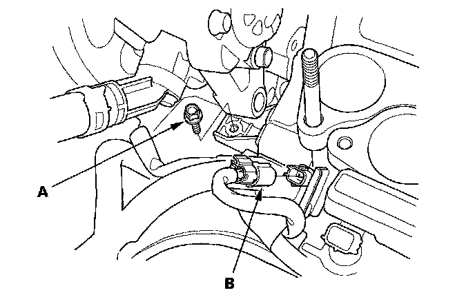 5. Remove the harness bracket mount bolt (A) and the knock sensor connector (B).