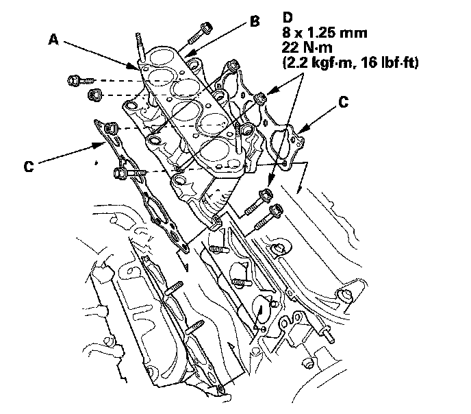 1. Install the front injector base (A) and rear injector base (B) with new gaskets (C), and tighten the bolts/nuts (D) in a crisscross pattern in two or three steps, beginning with the inner nuts.