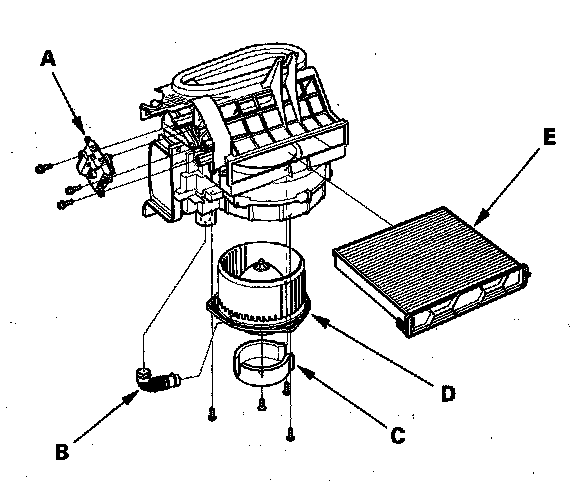 - The recirculation control motor (A), blower motor cooling hose (B), blower motor cover (C), the blower motor (D), and the dust and pollen filter (E) can be replaced without removing the blower unit.