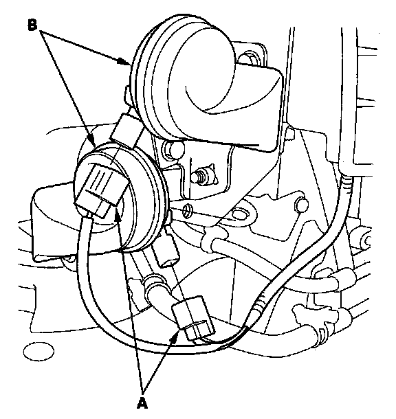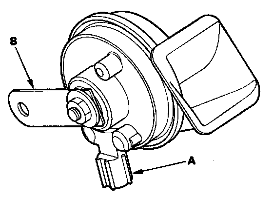 horn by connecting battery power to the terminal (A) and grounding the bracket (B). The horn should sound.