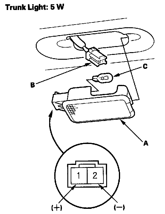 4. Check for continuity between the No. 1 (+) and No. 2 (-) terminals. There should be continuity. If there is no continuity, check the bulb (C). If the bulb is OK, replace the trunk light.