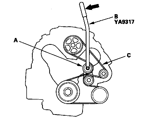2. Move the auto-tensioner (A) using the belt tension release tool (B) to relieve tension from the drive belt (C), then remove the drive belt.