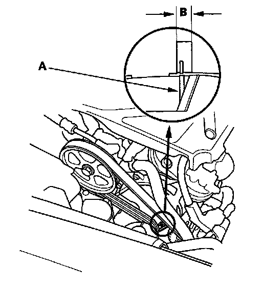 3. Check that the auto-tensioner indicator (A) is within the standard range (B) as shown. If it is out of the standard range, replace the drive belt.