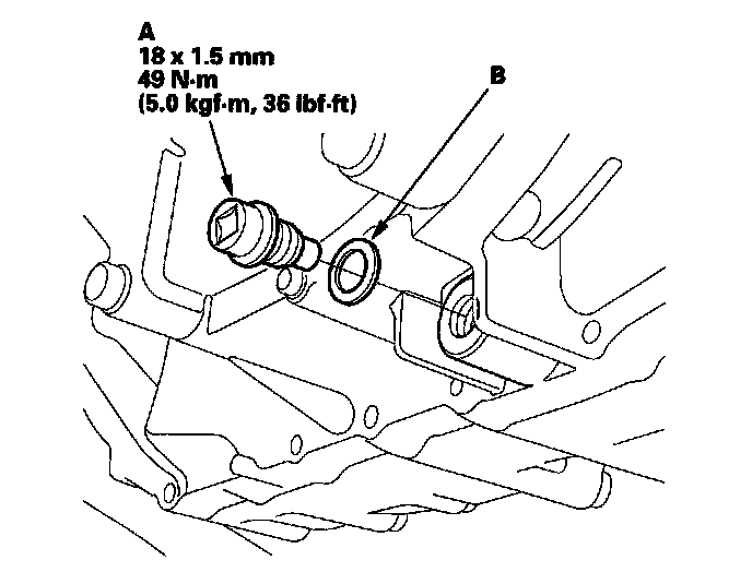 7. Refill the transmission with the recommended fluid through the filler hole (A). Always use Acura ATF DW-1 (ATF Z1 has been replaced by ATF DW-1, Honda Service News Nov 2010) Automatic Transmission Fluid (ATF). Using a non-Acura ATF can affect shift quality.