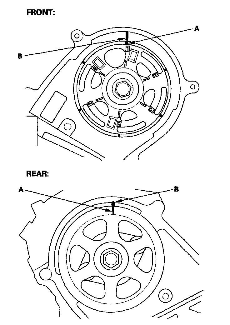 15. Turn the crankshaft pulley so its white mark (A) lines up with the pointer (B).
