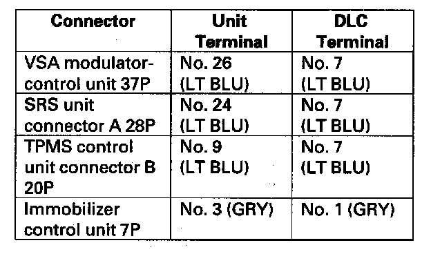 NO - Repair short in the wire between the DLC No. 7 (K-line) and the VSA modulator-control unit, the SRS unit, the audio unit, or the TPMS control unit or DLC No. 1 (DIAG-H line) and the immobilizer control unit.