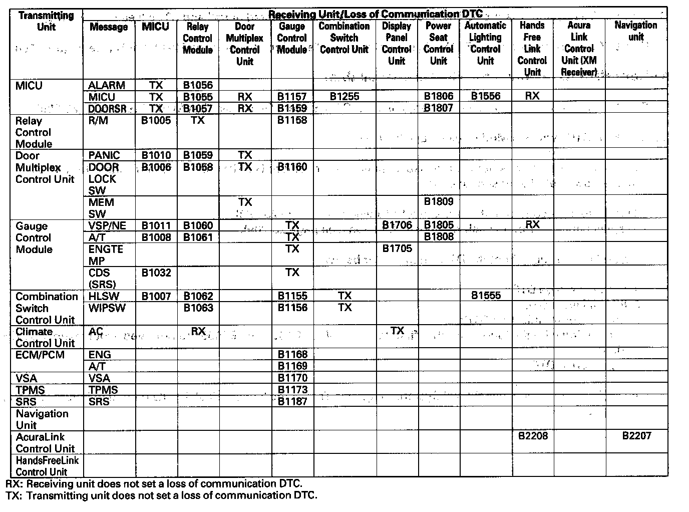When an ECU is unable to communicate with the other ECUs on the circuit, the other units will set loss of communication DTCs. Use this chart to find the control unit that is not communicating.