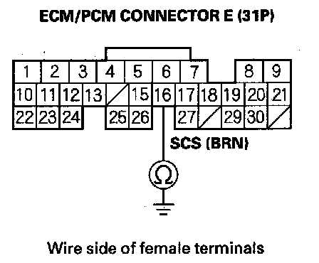 7. Check for continuity between ECM/PCM connector terminal E16 and body ground.