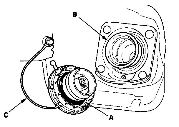 2. Check the fuel fill cap seal (A) and the fuel fill pipe mating surface (B). Verify that the fuel fill cap tether cord (C) is not caught under the cap.