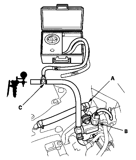 8. Disconnect the vacuum hose (A) from the EVAP canister purge valve (B) in the engine compartment, and connect a T-fitting (C) from the vacuum gauge and the vacuum pump/gauge 0 - 30 in.Hg, to the EVAP canister purge valve as shown.