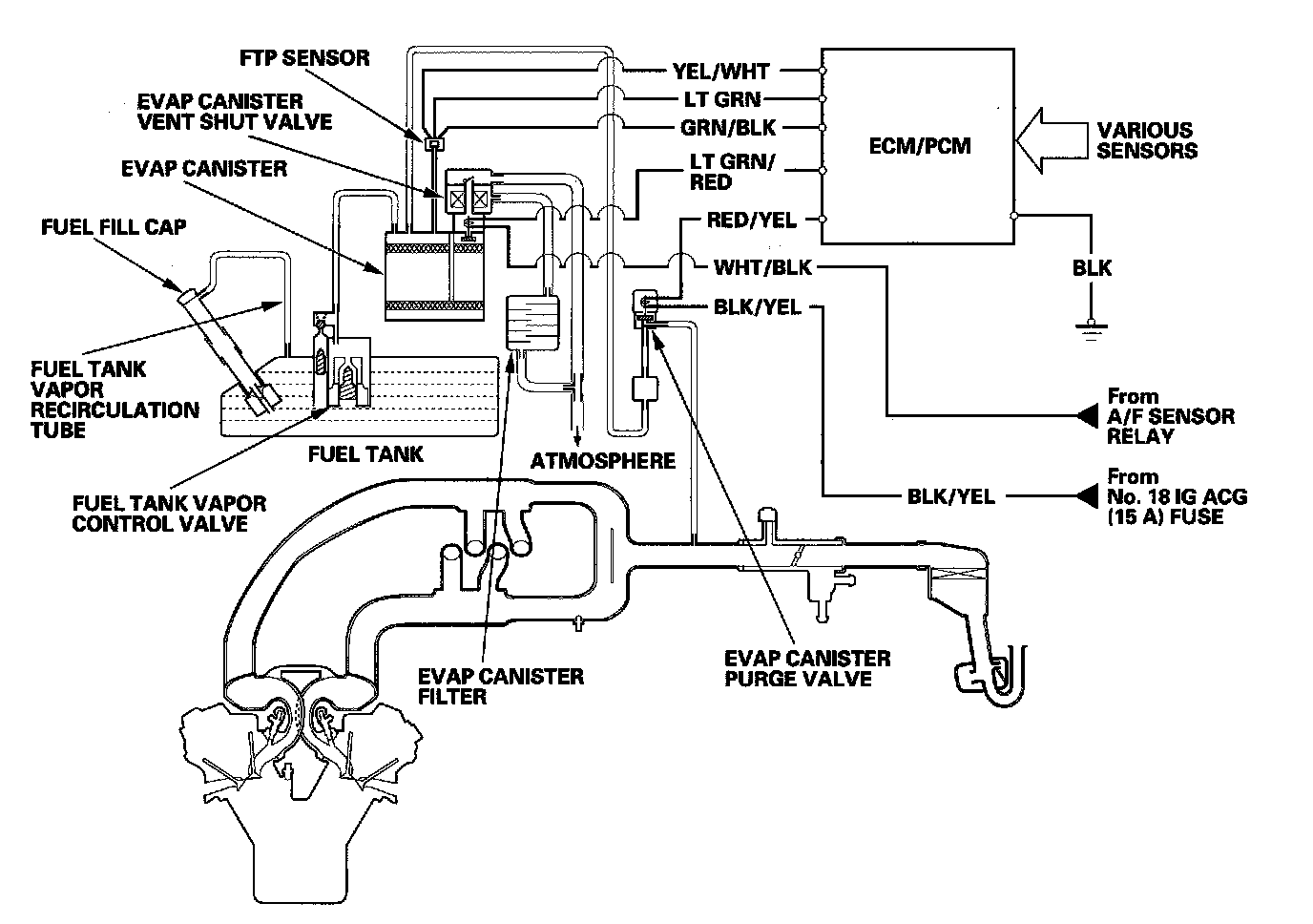 The EVAP controls minimize the amount of fuel vapor escaping to the atmosphere. Vapor from the fuel tank is temporarily stored in the EVAP canister until it can be purged from the canister into the engine and burned.