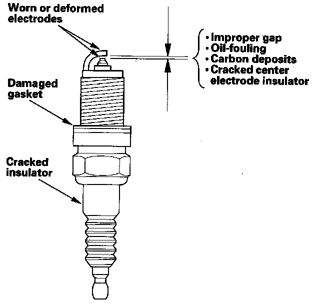 Spark Plug Inspection1. Remove the spark plugs, and inspect the electrodes and the ceramic insulator.