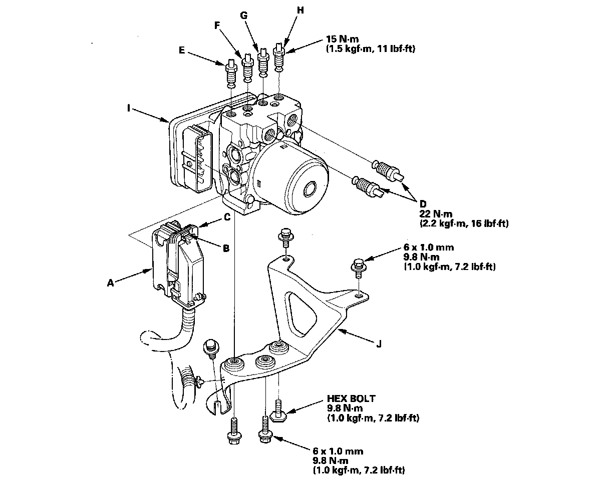 4. Remove the VSA modulator-control unit (I) with the bracket (J) from the body.