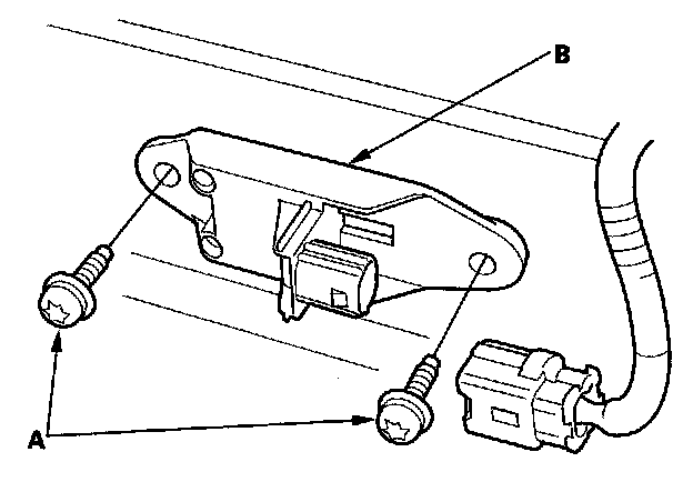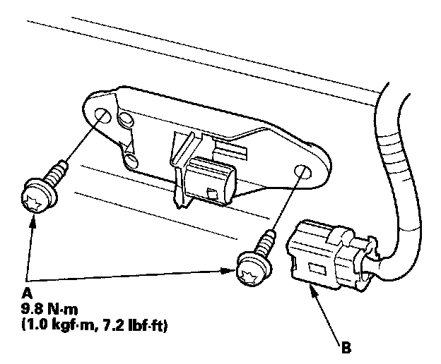 1. Install the new side impact sensor (first) with TORX bolts (A), then connect the floor wire harness 2P connector (B) to the side impact sensor (first).