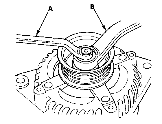 3. If the front bearing needs replacing, remove the pulley locknut with a 10 mm wrench (A) and a 22 mm wrench (B). If necessary, use an impact wrench.