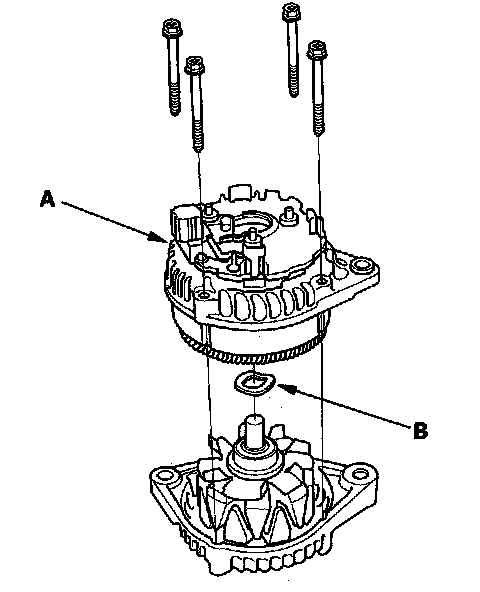7. Remove the four bolts, then remove the rear housing assembly (A) and washer (B).