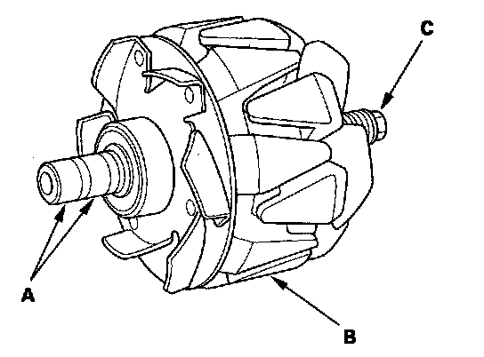 15. Check for continuity between each slip ring and the rotor (B) and the rotor shaft (C).