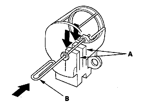 19. Push the brushes (A) in, then insert a pin or drill bit (B) (about 1.6 mm (0.06 in.) diameter) to hold them there.