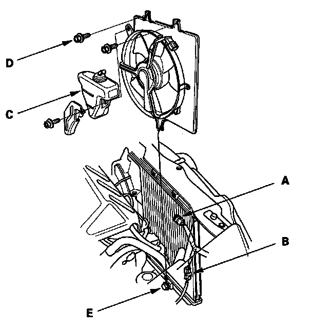 4. Remove the two upper bolts (D), loosen the lower bolt (E), then remove the A/C condenser fan shroud assembly.