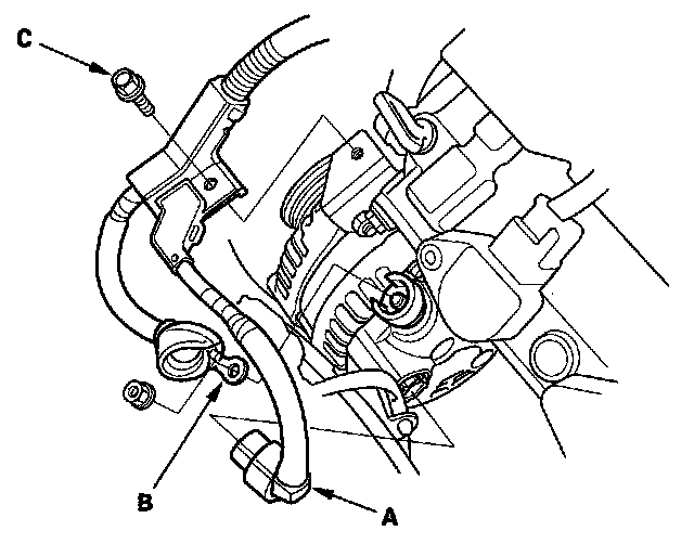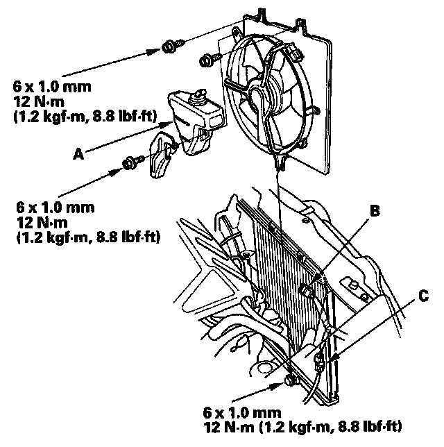 3. Disconnect the A/C condenser fan motor connector (A) and the A/C compressor clutch connector (B), then remove the coolant reservoir (C).