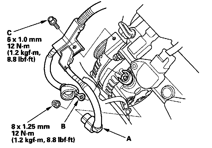 1. Install the alternator, then tighten the mounting bolt (A) and alternator bracket mounting bolt (B).
