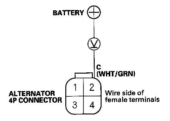 7. Measure the voltage between alternator 4P connector terminal No. 2 and the positive terminal of the battery.