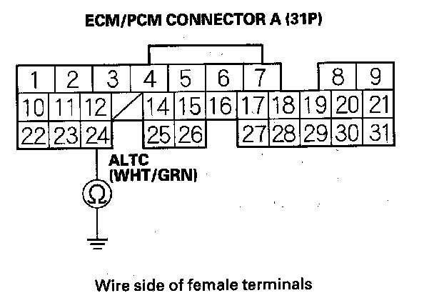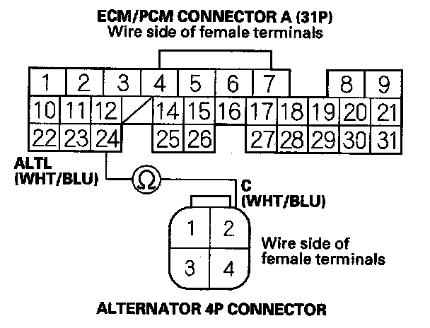 13. Check for continuity between ECM/PCM connector terminal A24 and alternator 4P connector terminal No. 2.