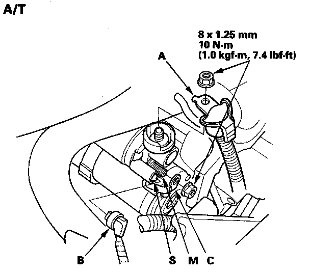 4. Disconnect the starter cable (A), BLK/WHT wire (B), and motor cable (C).