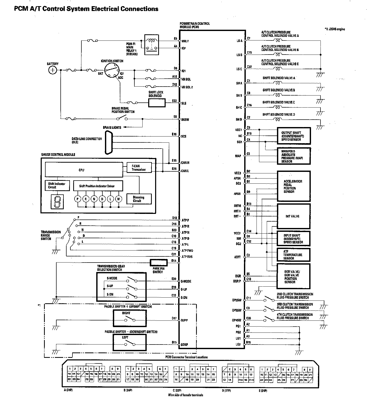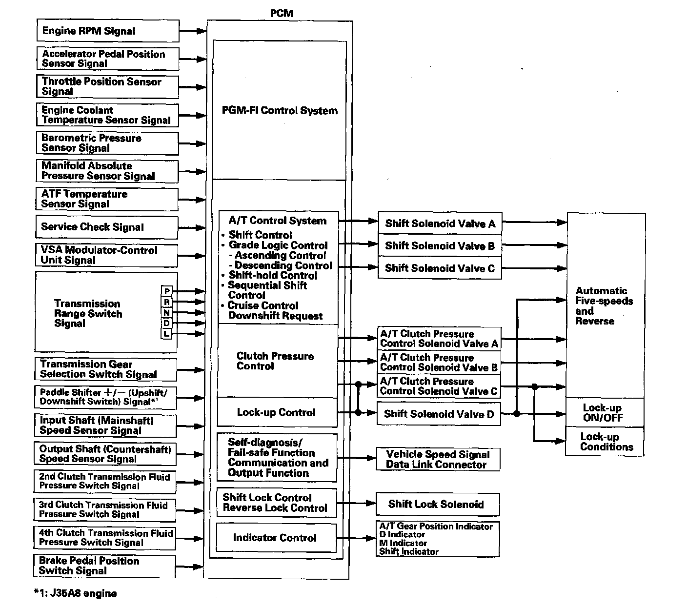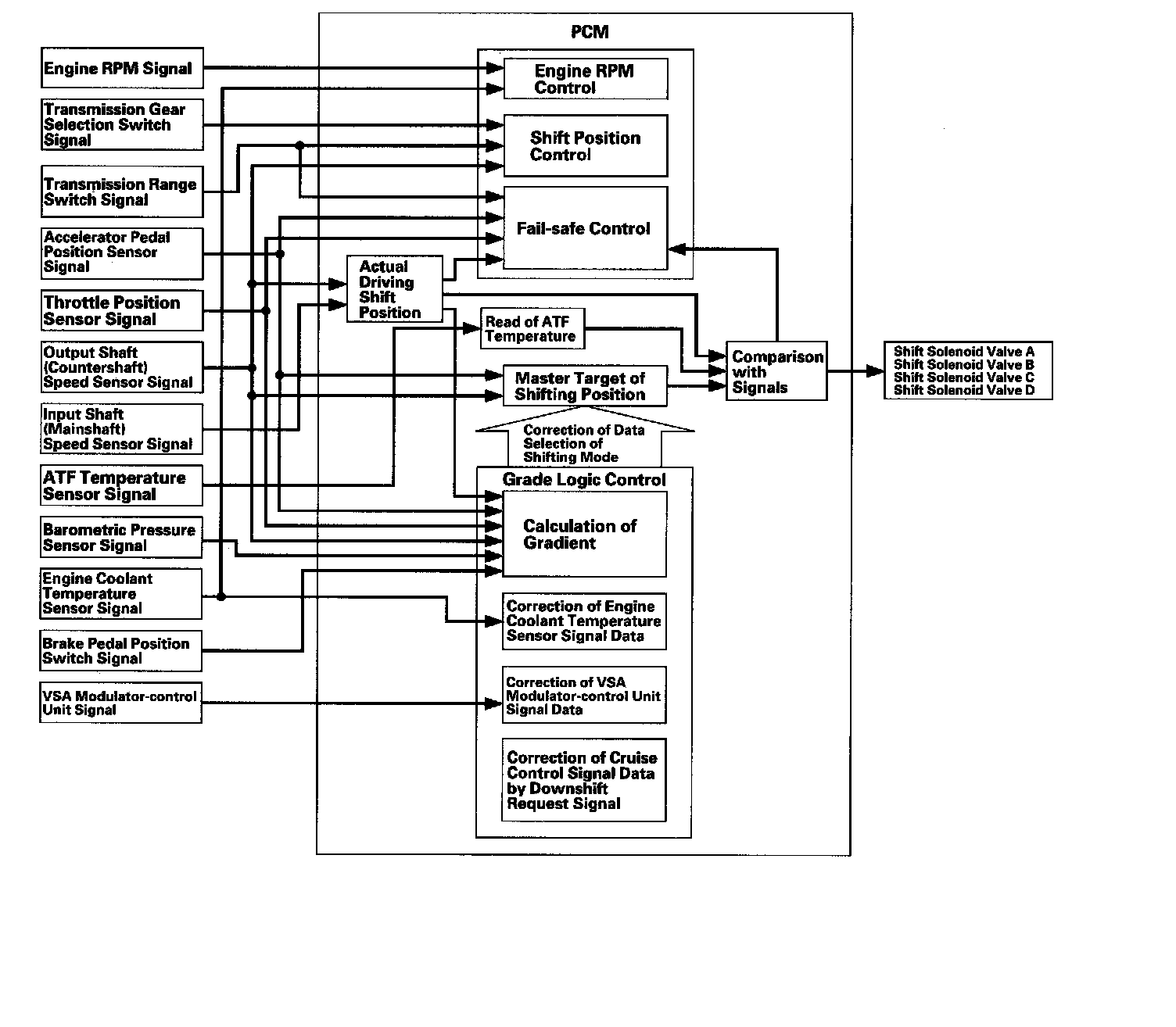 The PCM receives input signals from the sensors, switches, and other control units, processes data, and outputs signals for the engine control system and A/T control system. The A/T control system includes shift control, grade logic control, clutch pressure control, and lock-up control. The PCM switches the shift solenoid valves and the A/T clutch pressure control solenoid valves to control gear selection and lock-up torque converter clutch.