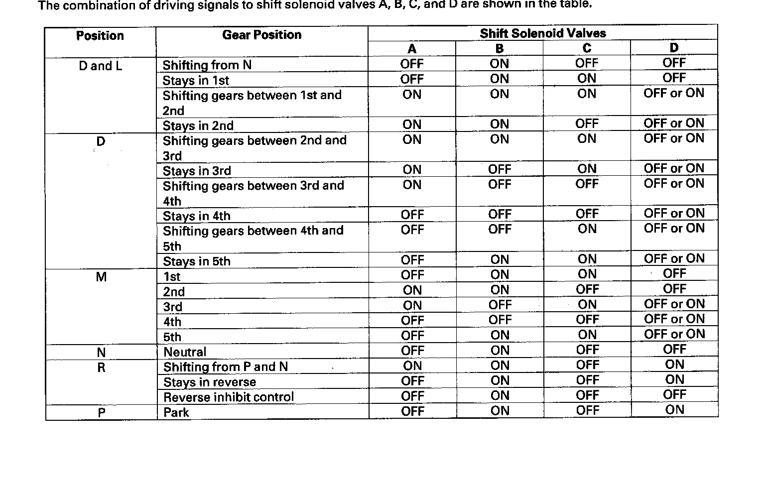 ^ Shift solenoid valves A and D use ON-OPEN/OFF-CLOSE type; shift solenoid valve opens the port of shift solenoid valve pressure while shift solenoid valve is turned ON by the PCM, and closes the port when shift solenoid valve is OFF.