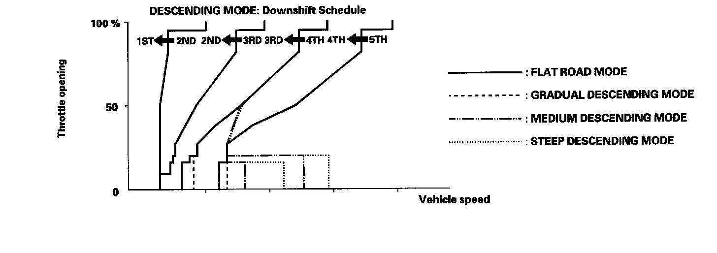 When the PCM determines that the vehicle is going down a hill in D, the shift-up speed from 4th to 5th gear, 3rd to 4th gear, and from 2nd to 3rd (when the throttle is closed) becomes faster than the set speed for flat road driving to extend the 4th gear, 3rd gear, and 2nd gear driving areas. This, in combination with engine braking from the deceleration lock-up, achieves smooth driving when the vehicle is descending. There are three descending modes with different 4th gear driving areas, 3rd gear driving areas, and 2nd gear driving areas according to the magnitude of a gradient stored in the PCM. When the vehicle is in 5th or 4th gear and you are decelerating while applying the brakes on a steep hill, the transmission will downshift to a lower gear. When you accelerate, the transmission will then return to a higher gear.