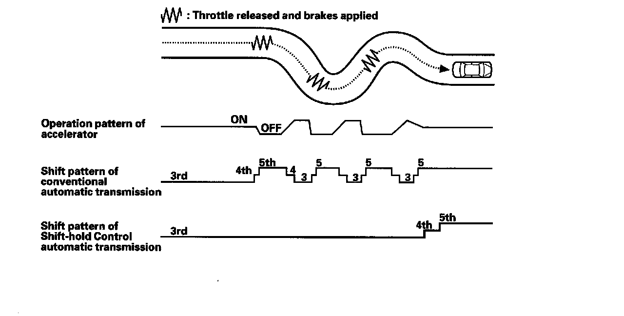 When negotiating winding roads, the throttle is suddenly released and the brakes are applied, as is the case when decelerating at the entrance of a corner, Shift-hold Control keeps the transmission in its current (lower) ratio as it negotiates the corner and accelerates out.