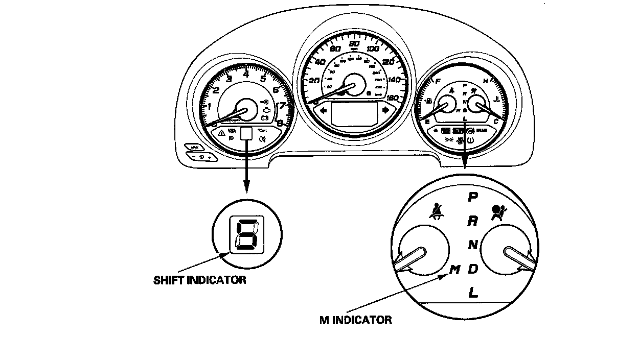 In M; the sequential shift mode, the M indicator comes on, and the shift indicator displays the number of the gear selected.