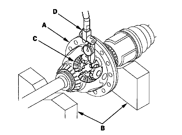 3. Measure the backlash of the pinion gears (C) using a dial indicator (D).